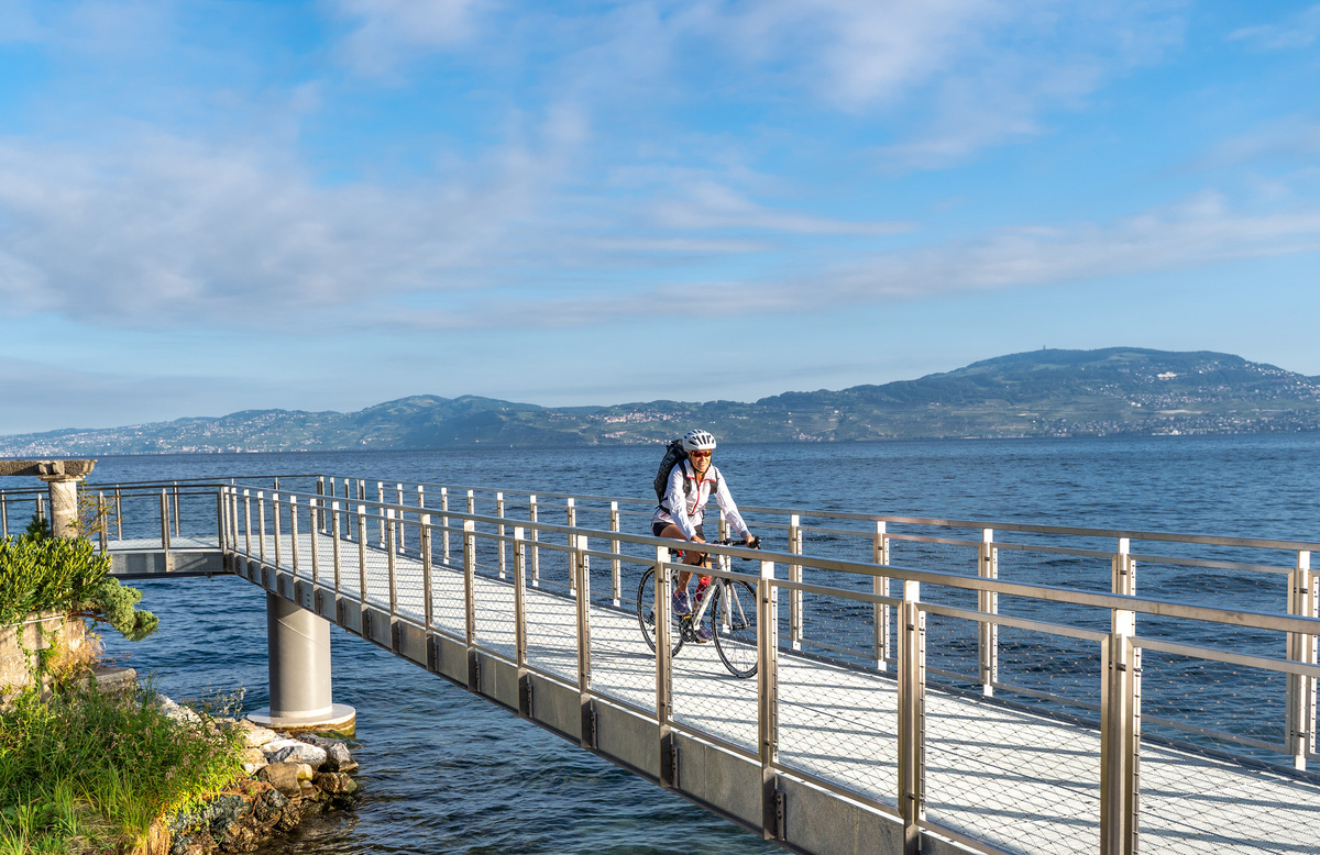 Les premières étapes révèlent la grandeur alpine. Depuis Thonon-les-Bains ou Evian, sur les rives du Lac Léman, le cycliste découvre des panoramas spectaculaires : les eaux bleues du lac reflètent les sommets enneigés des Alpes, tandis que les villages alentours, comme Yvoire, avec ses ruelles médiévales fleuries et ses remparts, offrent une halte charmante. Les pistes cyclables s’avancent le long du Rhône naissant, entre champs de lavande, vergers et prairies alpines, offrant une expérience sensorielle riche entre air pur, senteurs de fleurs et panoramas grandioses.