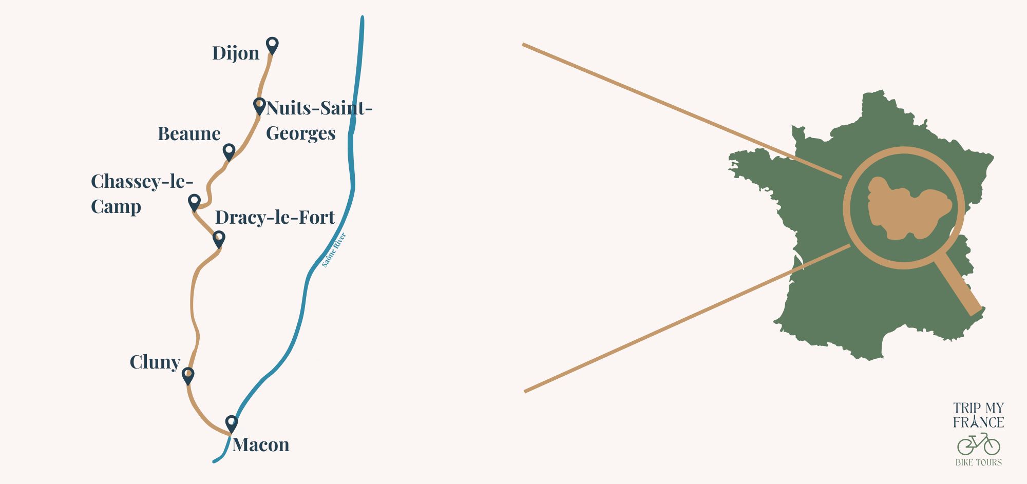 Partez à la découverte de la Bourgogne à vélo, l’une des plus belles régions viticoles de France, à travers un itinéraire cyclable de Dijon à Mâcon. Ce circuit combine parfaitement plaisir du vélo, patrimoine culturel et dégustation de vins. Vous suivrez la légendaire Route des Grands Crus, en traversant des appellations prestigieuses telles que Gevrey-Chambertin, Nuits-Saint-Georges, Beaune, Meursault, Puligny-Montrachet ou encore Santenay.