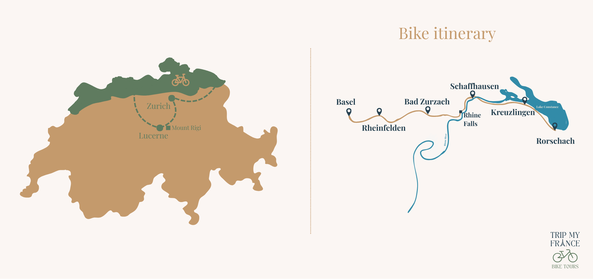Au fil des étapes, vous pédalez sur des pistes cyclables parfaitement aménagées qui traversent vergers, vignobles, forêts et charmantes localités suisses. Le voyage se conclut par la découverte de Lucerne et des Alpes, avec des panoramas grandioses entre lacs et sommets, pour une expérience complète mêlant nature, patrimoine et plaisir du vélo.