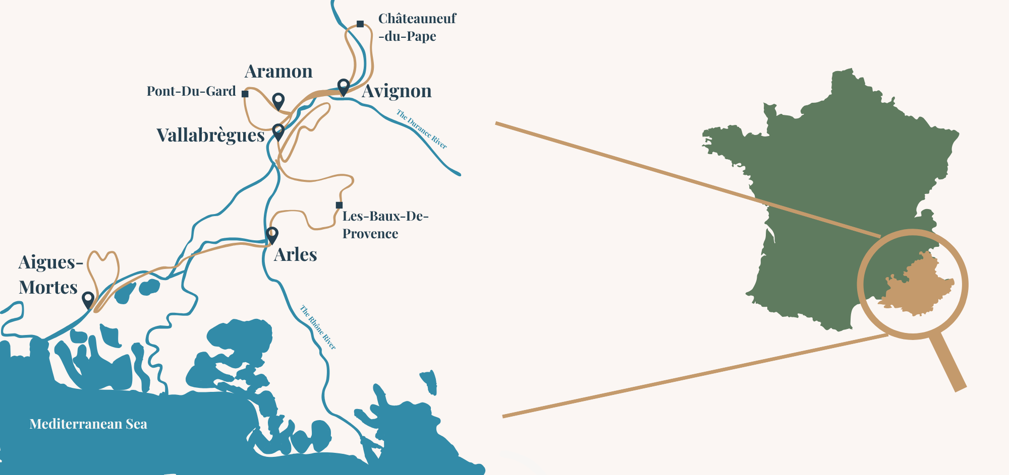 Depuis votre péniche-hôtel confortable, vous alternez entre navigation tranquille sur le Rhône et étapes à vélo accessibles. Quelques visites culturelles ponctuent ce voyage. Vous explorez tour à tour Avignon et la cité des Papes, Châteauneuf-du-Pape et ses vins réputés. Vous découvrez aussi Saint-Rémy-de-Provence et Les Baux-de-Provence au cœur des Alpilles. Pour finir vous arrivez à Arles, puis Aigues-Mortes, cité médiévale entourée de remparts.