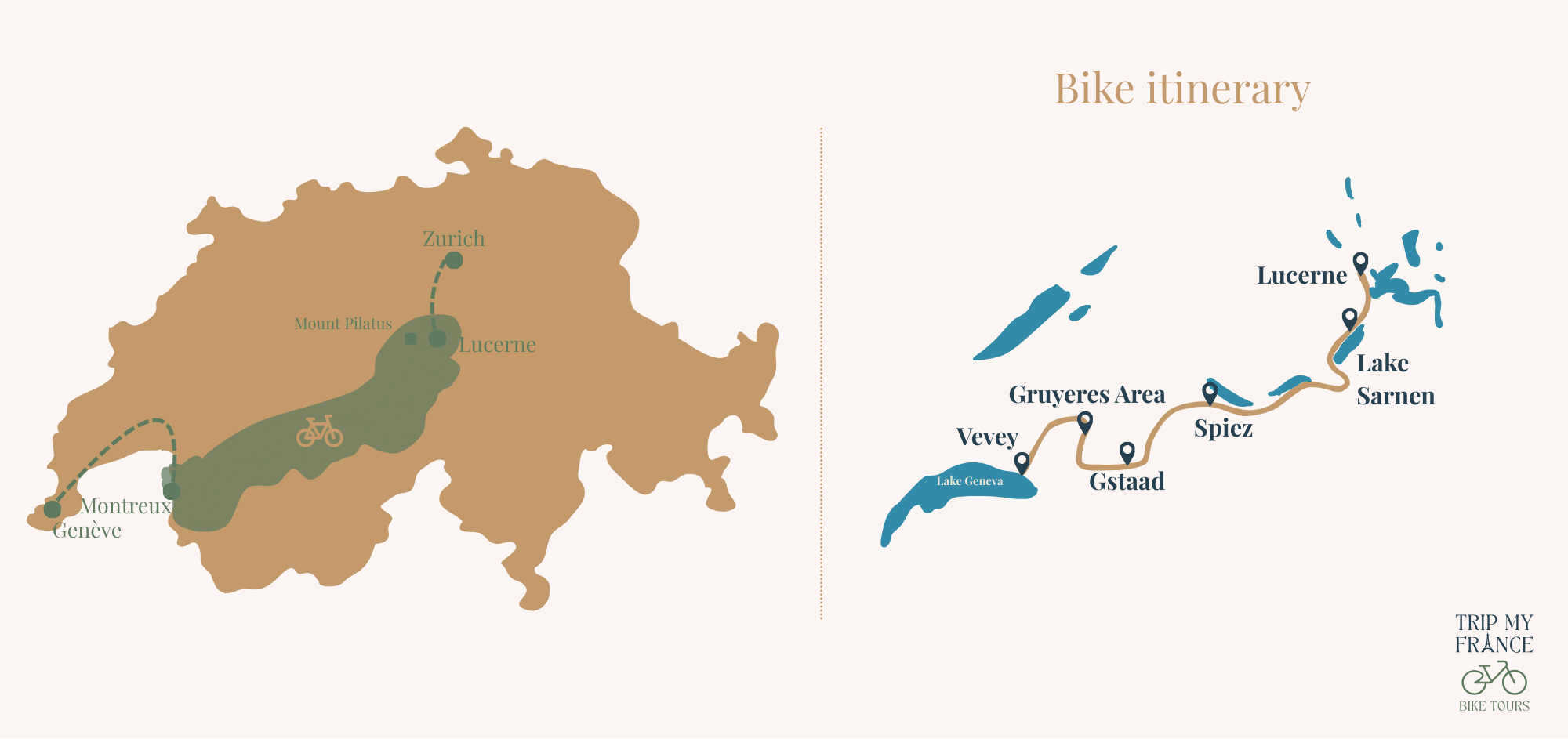 Vous pédalez dans un environnement serein dominé par le Mont Pilatus, entre rives paisibles et villages discrets. L’approche de Lucerne dévoile le Lac des Quatre Cantons et ses reliefs impressionnants. Dans la vieille ville, ruelles pavées et maisons peintes mènent au célèbre Pont de la Chapelle. C'est le cadre parfait pour conclure cette étape autour d’une promenade et d’une douceur suisse face au lac.